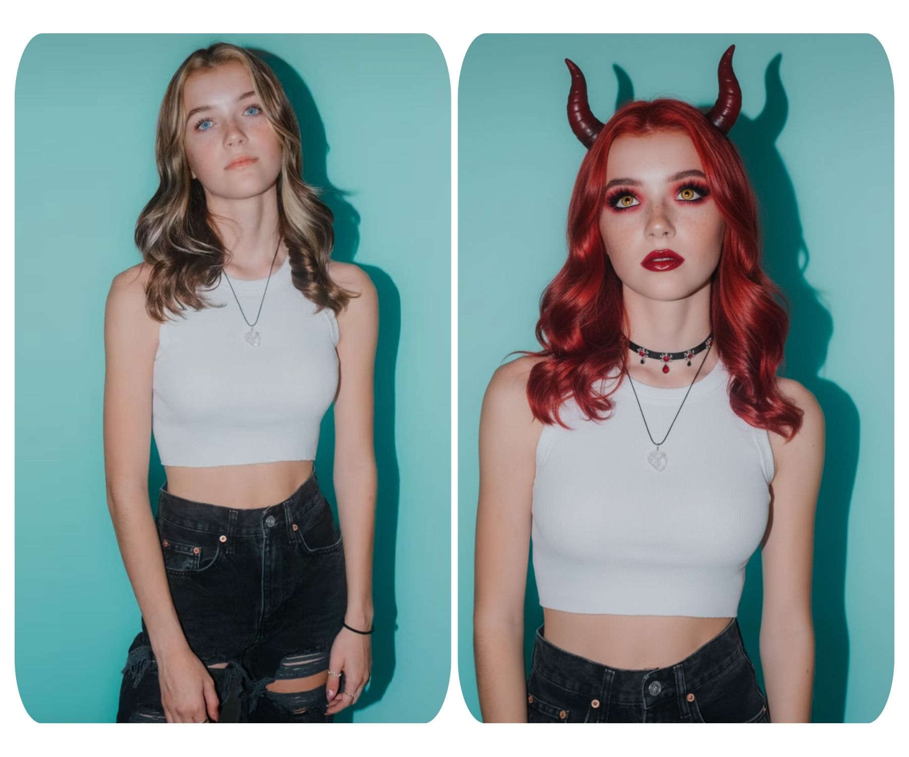 Use the same person, outfit, background, lighting, facial features, and pose as in the reference image. Transform them into a “Halloween Little Demon” look. Change hair to vivid red. Apply dramatic, high-end demon-inspired makeup: deep red eyeshadow covering the lids, bold lower lashes, and glossy blood-red lips. Use a fair, slightly pale foundation with subtle freckles on the cheeks and nose. Give the eyes golden contact lenses outlined in black, adding a piercing, supernatural gaze. Add elegant, curved demon horns and stylish mystical jewelry accessories. The overall look should be luxurious, mysterious, and visually striking, with cinematic lighting and realistic photo detail.