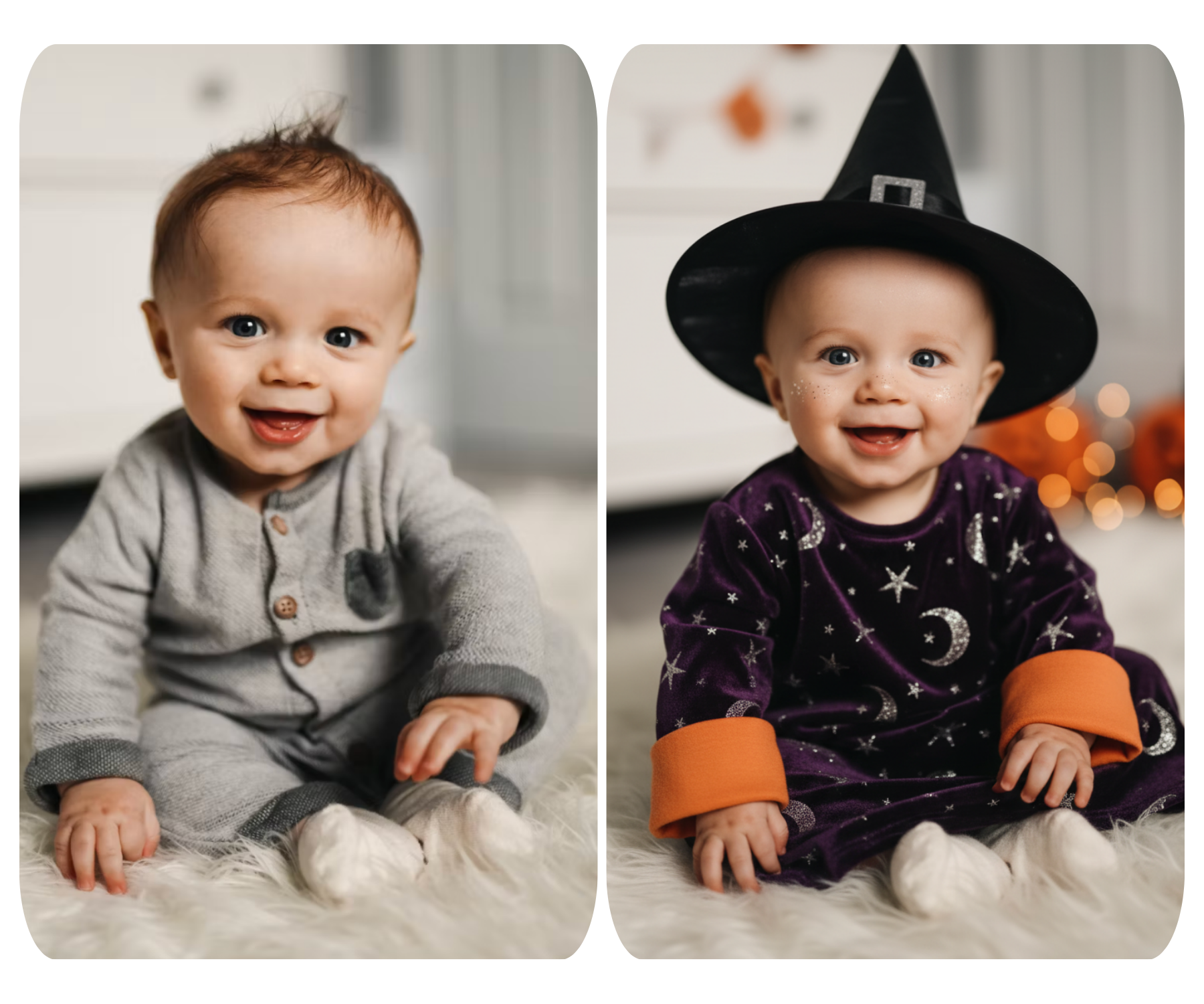 Transform the image into a cute child witch Halloween look. Keep the facial features intact. Add a small pointed hat, subtle sparkling makeup, and a playful robe. Maintain the childlike proportions and cheerful atmosphere.