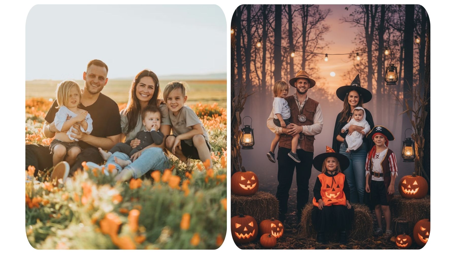 Take a Halloween outdoor photo shoot for all people in the picture. keeping everyone’s original facial features exactly the same — preserve their eyes, noses, mouths, and face structures.Change only their clothing, poses, and background.
