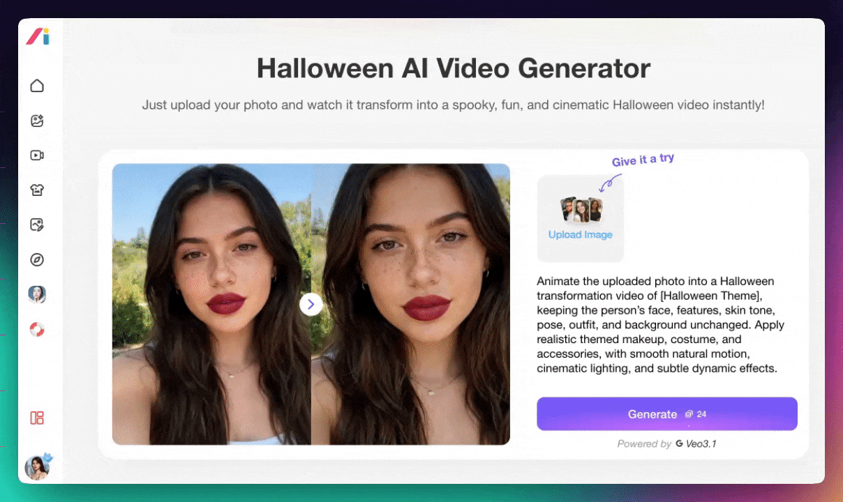 After you've created your ideal spooky picture, why stop there? Now that AI can put those Halloween creations into motion. Our Halloween AI Video Generator will take your photos and turn them into cinematic creepy videos - complete with motion, lighting effects, and a spooky vibe in seconds. It is like standing in your very own Halloween movie!