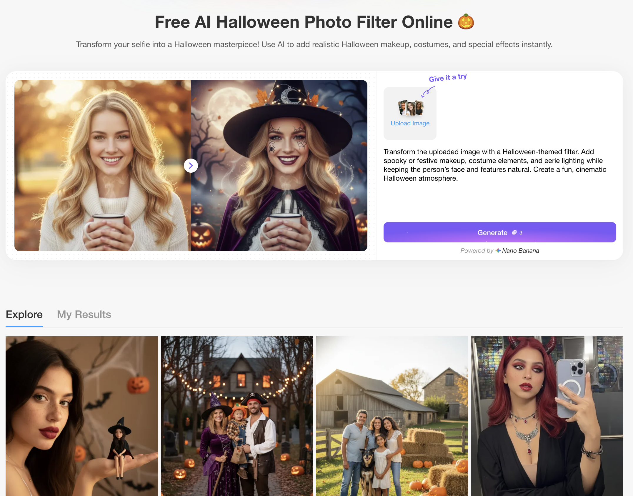 Looking for a quick and easy way to create spooky Halloween effects? Our AI Halloween Photo Generator lets you produce stunning Halloween-themed photos in seconds — no complicated setup needed. Ready-to-use prompts make it simple to get started and bring your creepy ideas to life!