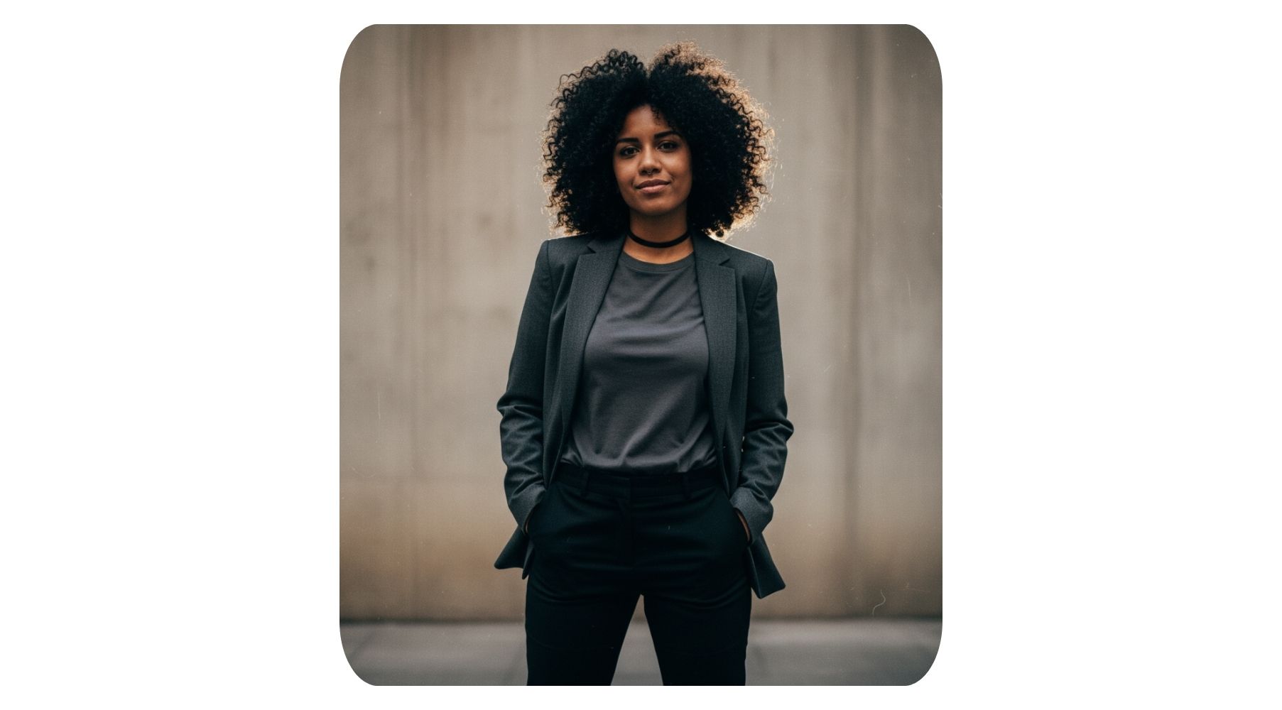 Outfit: Minimalist business attire, refined and tasteful.