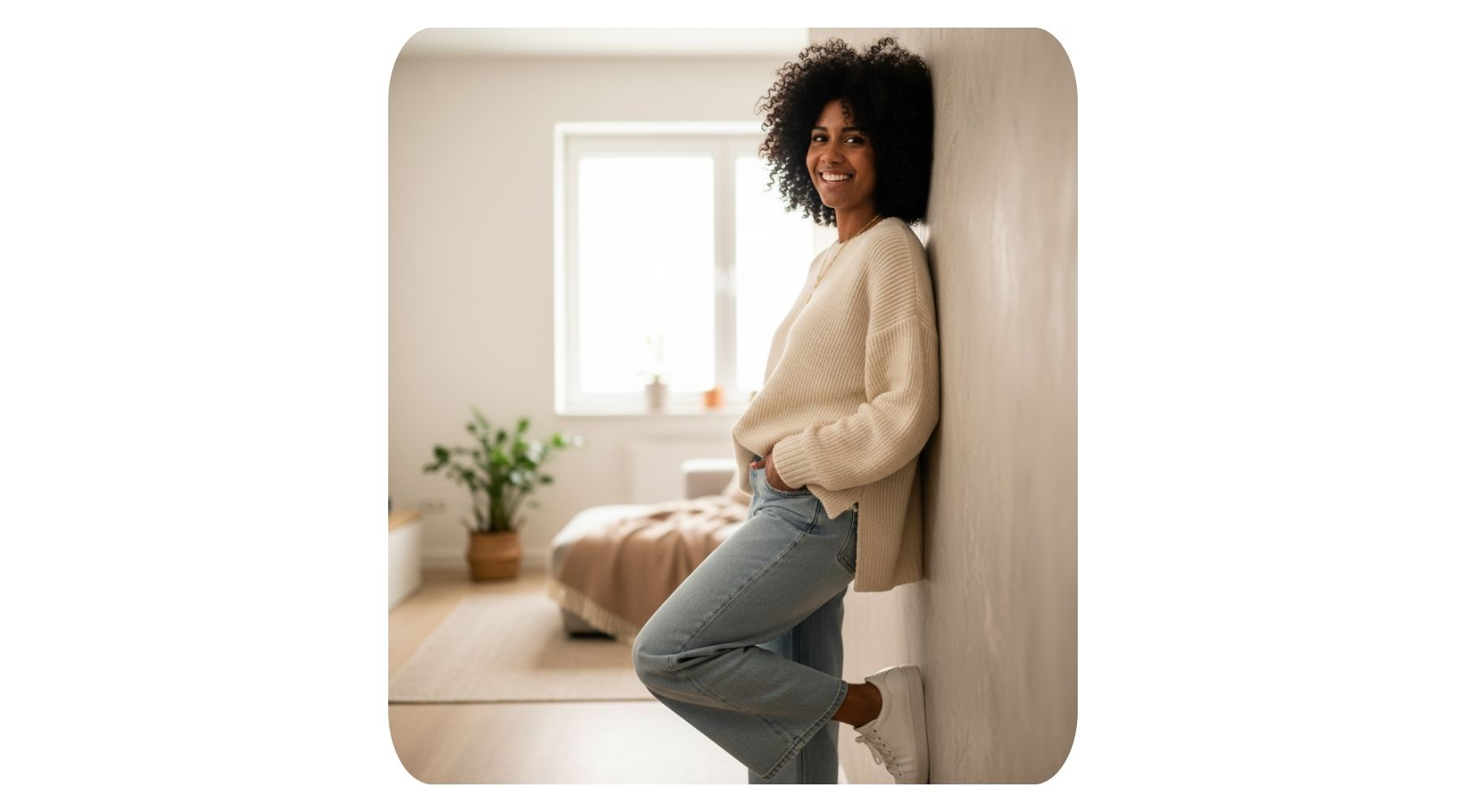 Transform the image into a stylish lifestyle portrait. Pose: natural and relaxed. Outfit: casual, contemporary clothing. Lighting: soft natural or studio lighting. Background: blurred environment (indoor or outdoor). Focus on mood, personality, and visual appeal.