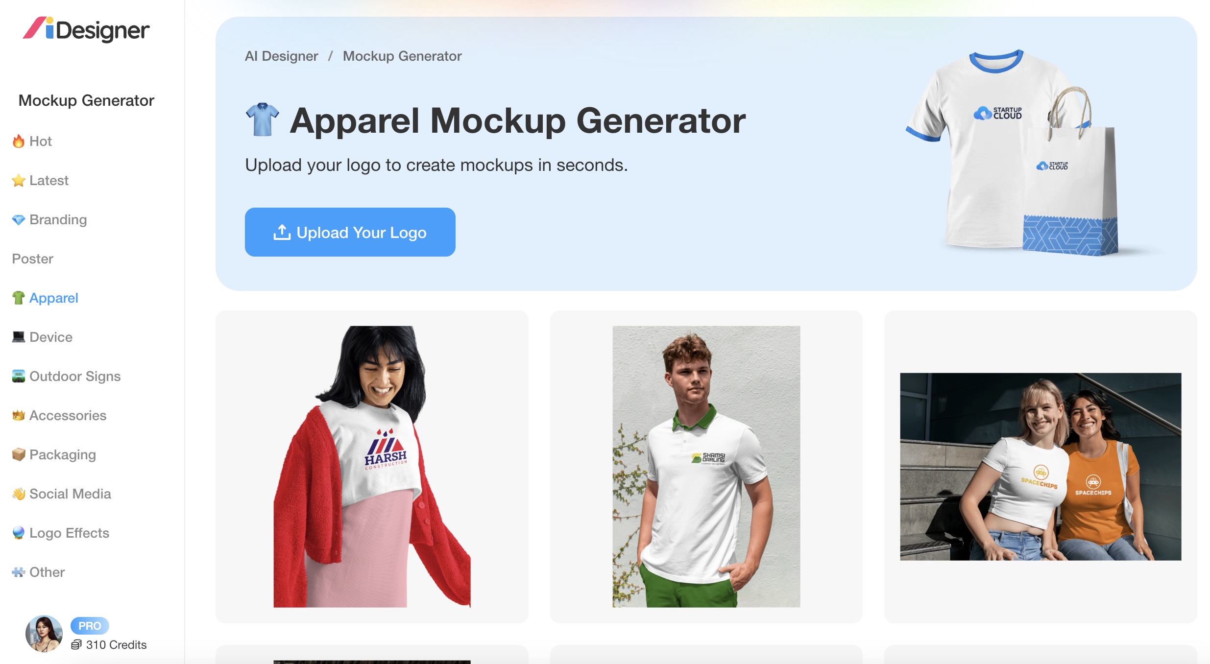 It's always a good idea to see how your design looks in real life before sending it to print. You can quickly see your logo on a t-shirt with LogoAI's Apparel Mockup Generator. Just upload your logo, select from a variety of t-shirt designs, and get lifelike mockups to help you decide on your design. Ideal for client previews, presentations, or simply checking that everything looks good before printing.