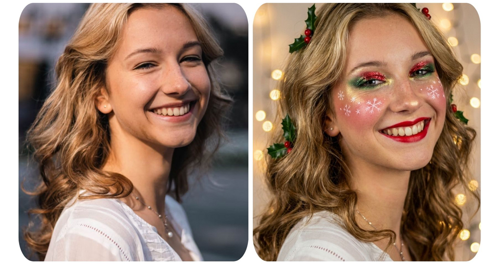 A woman displays festive Christmas makeup in this portrait which includes glittery red and green eyeshadow and gold highlighter and red lipstick and pink blush. The image includes Christmas elements through snowflakes on her cheeks and holly leaves in her hair and background lights that create a warm twinkling effect. The image features soft holiday lighting that looks realistic while maintaining high definition and vibrant colors to create a cheerful atmosphere.