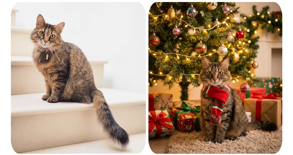 Create a Christmas photo of the pet which maintains its appearance. The pet should wear either a Santa hat or a scarf or a Christmas bow to create a festive look. The pet should be placed under warm lighting while being surrounded by a Christmas tree and fairy lights and gift boxes. The entire scene presents a joyful and cozy atmosphere which resembles a holiday greeting card.