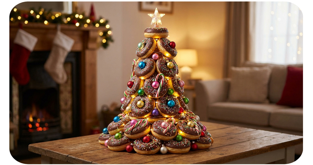 A Christmas tree emerges from a pile of chocolate donuts. The donuts maintain their original shape while receiving decorative elements including colorful ornaments and candy canes and sprinkles and fairy lights and a small star for the top. The creation should present a whimsical and bright and festive atmosphere which evokes a cozy and playful Christmas spirit.
