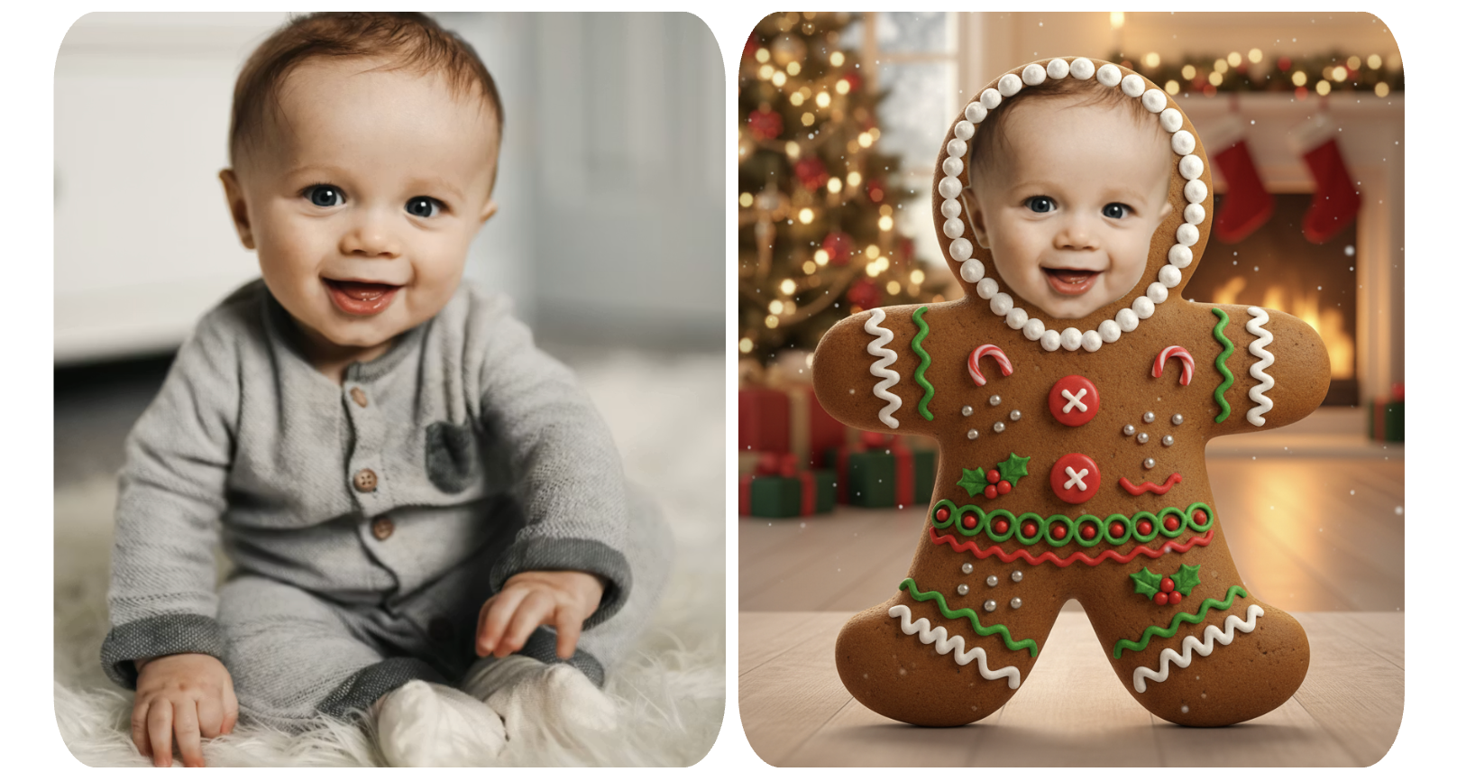 Create a cute Christmas gingerbread, replacing the original gingerbread face with the uploaded photo. Add adorable Christmas elements to the gingerbread body, with a festive Christmas-themed background.