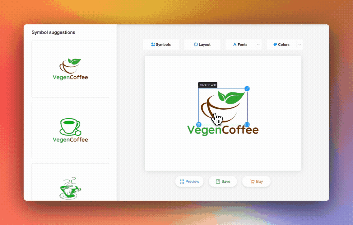 Now that you've chosen the right font and logo symbol, it's time to explore the creative possibilities with layout and color. To assist you in this creative process, our AI-powered LogoAi editor comes with handy features: "suggest new layout" and "suggest new colors".