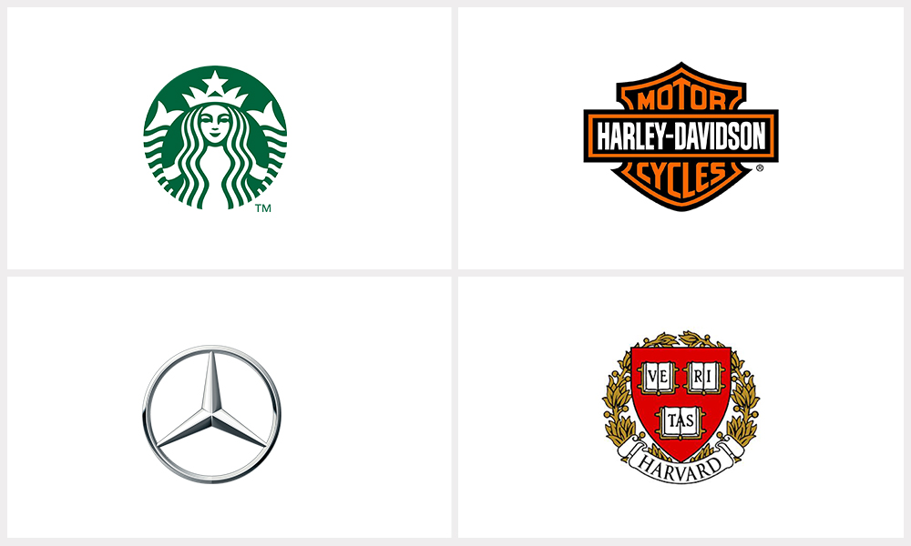 Classic examples are the Starbucks siren, Harley-Davidson's bar & shield, Mercedes' three-pointed star, and the Harvard University crest logo.