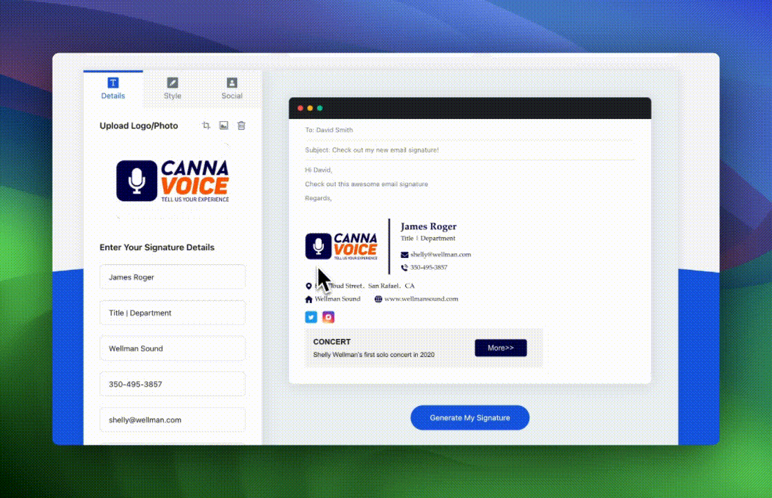 Try to keep your email signature simple and only add the essential information to keep a professional image. Test your generated email signature on different email platforms to making sure it looks good everywhere. Double check your contact information is accurate and there are not broke links.