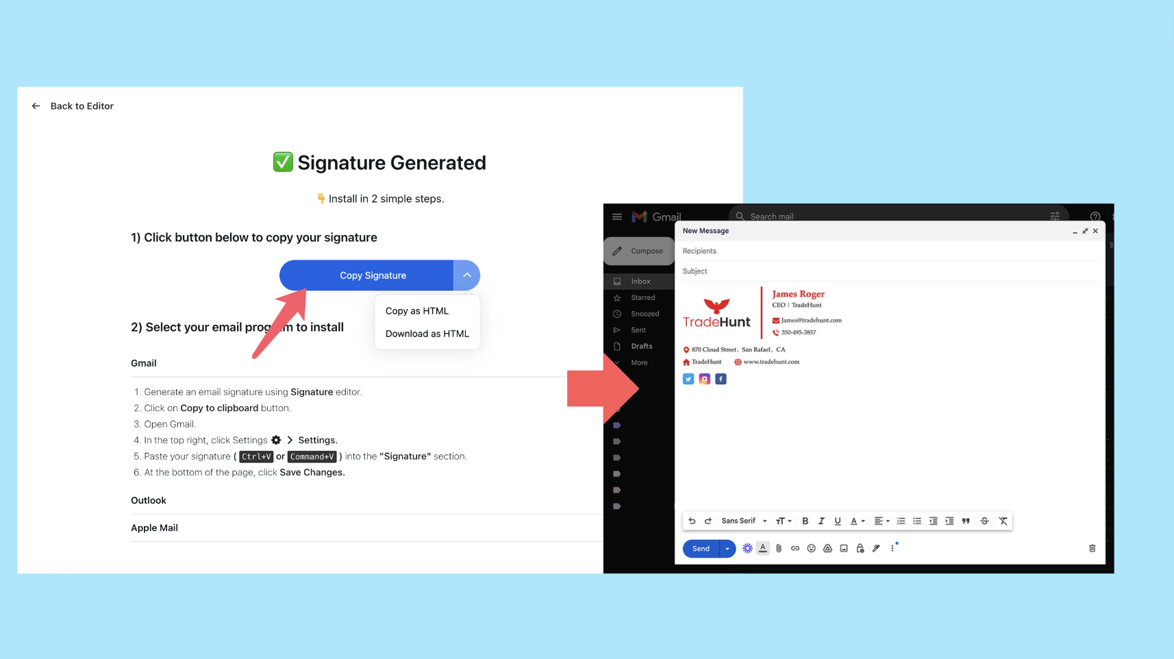 After your signature is successfully generated, simply click on "copy signature" or click the drop down arrow to copy your signature as HTML or download it as an HTML file. Next, open your email client (Gmail, Outlook, or Apple Mail) to install your signature. For Gmail, go to Settings, then paste your signature in the "Signature" section and click "Save Changes." This straightforward process ensures your email signature is correctly installed and ready for use. Alternatively, you can also consider using business cards by Uniqode as an option in your email signature. Highly customizable you can add your logo and other branding elements along with links and QR codes.
