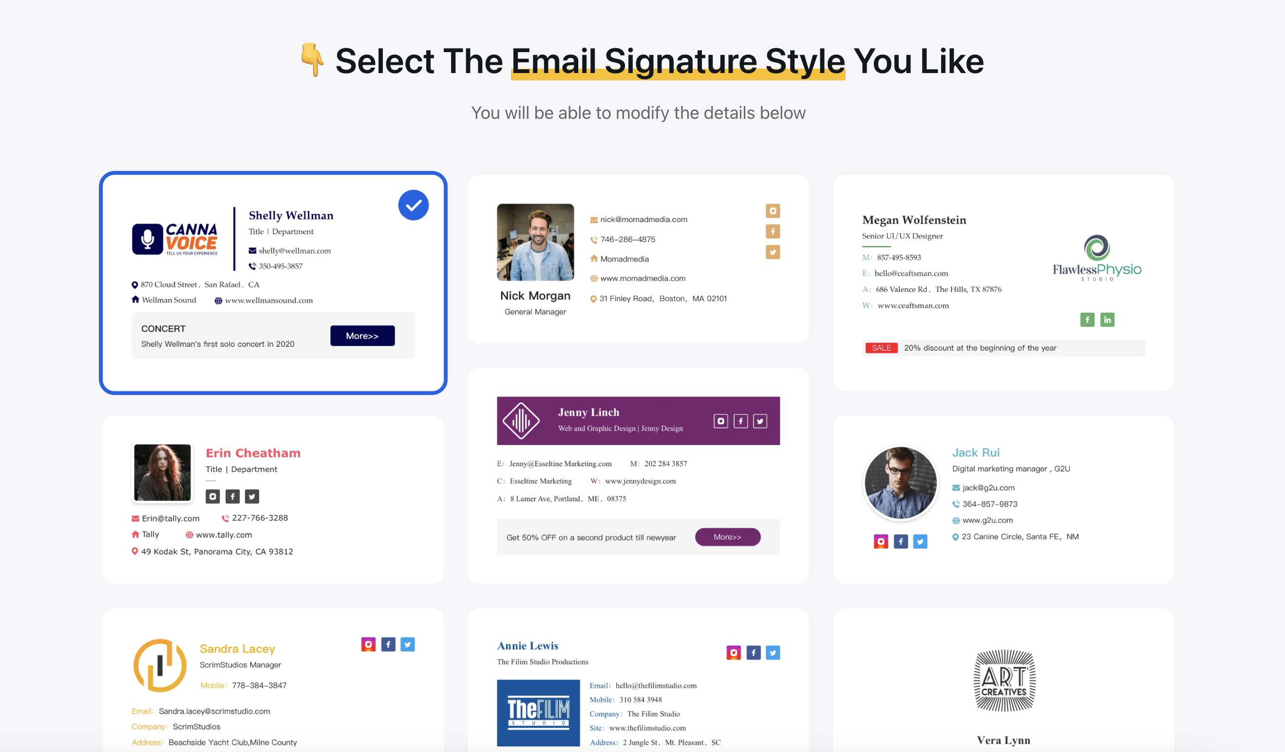 We offer a variety of well-designed email signature templates for you to choose from. They have different style and layouts. Each templates allow further personal customization. You can choose any template and edit from there to add your logo/ photo and change the template style to align with your brand identity better.