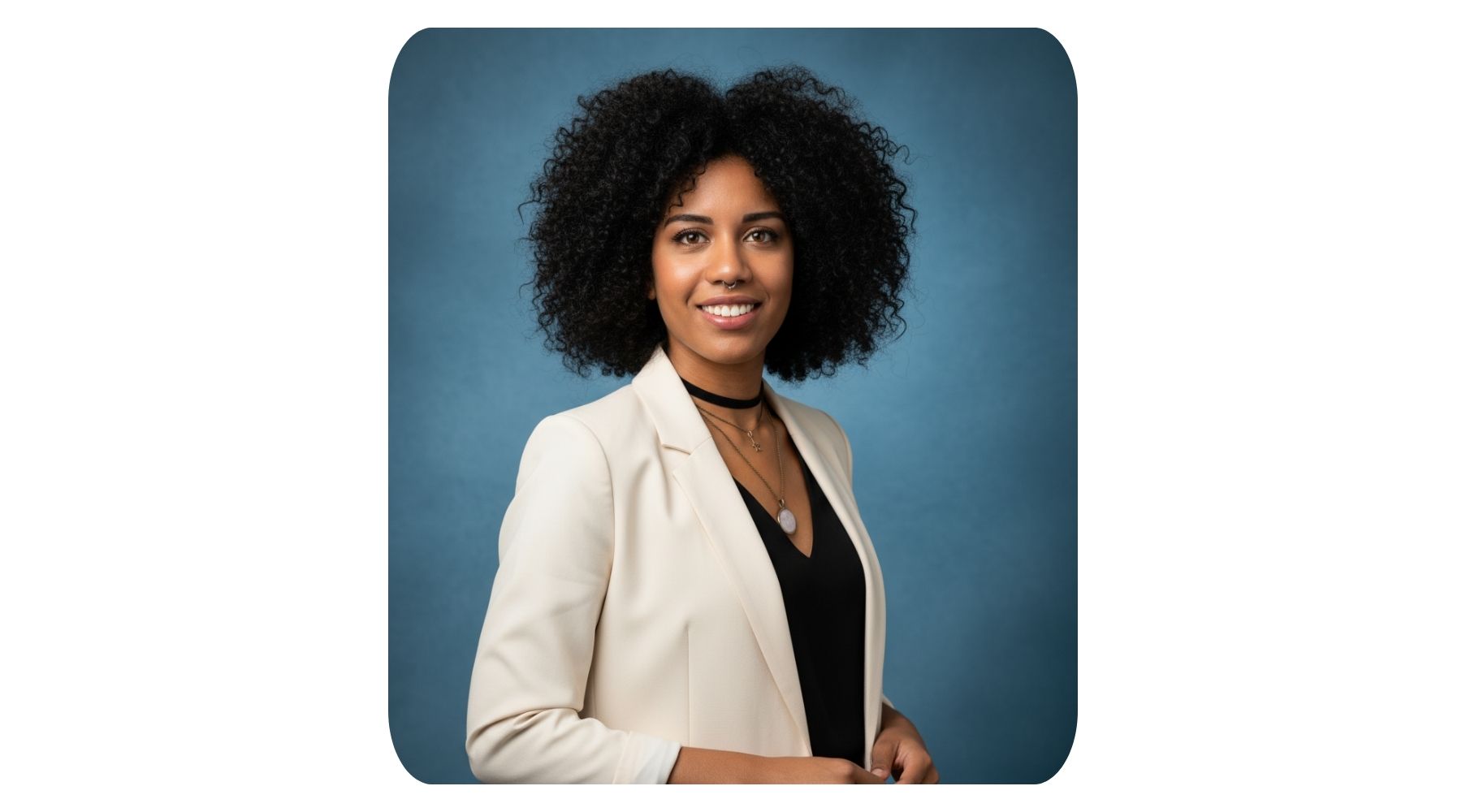 Background: Blue textured studio backdrop with soft, natural lighting.