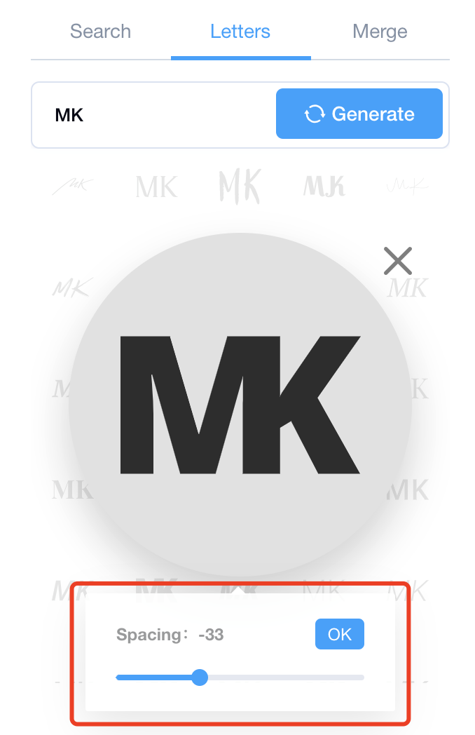 With multi-letter icon, you can even adjust the letter spacing to create unique and interesting symbol for your logo. To do that, simply click on the logo icon on the canvas, then the letter tab on the left and when you choose the font you will see the screen below to adjust letter spacing.