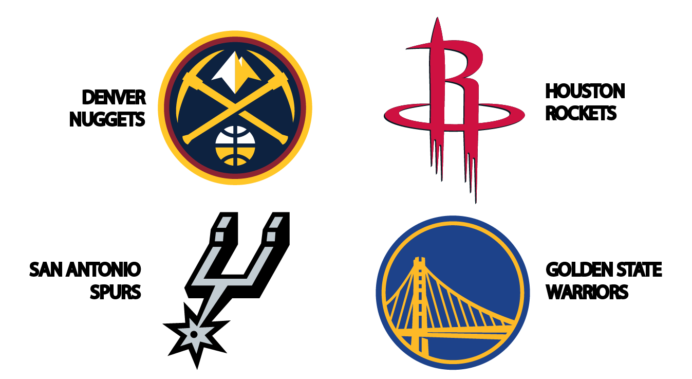 Regional Representation: NBA logos often serve as visual love letters to their hometowns, incorporating symbols and motifs that reflect the team’s local culture, history, and pride. These carefully chosen elements allow fans to connect with the logo on a personal level. For example, the Denver Nuggets incorporate a mountain and two pickaxes, which pay homage to Denvers historic mining town identity. The San Antonio Spurs choose to focus on cowboy culture, which is infamous in their home state of Texas. The Houston Rockets make sure to play with the imagery of a rocket blasting off, referencing the space center at Houston. Last but not least, the Golden State Warriors show a simple (but impactful) silhouette of the state's famous Golden Gate Bridge.