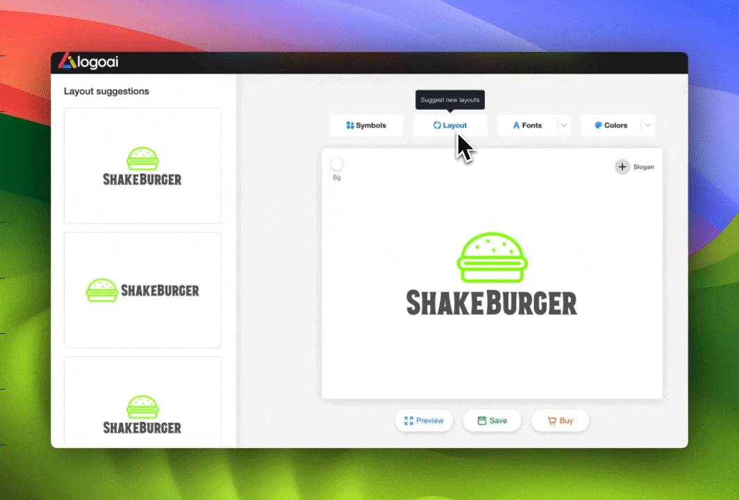 Once the font upload is complete, you'll be introduced to a variety of customization options. You will be able to customize the logo layout and logo colors, select a font color that match with the logo symbol, test different layouts, and make use of the color picker tool for the perfect logo color, you can even upload your own logo symbol for further customization.