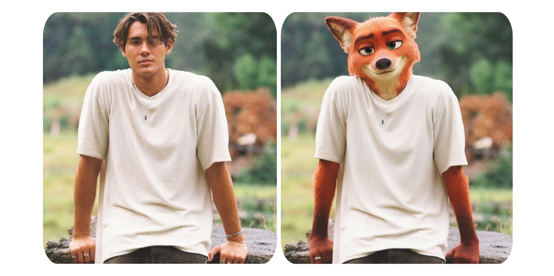 Transform the person in the photo into Nick Wilde from Zootopia, while keeping the original cloth, pose and positioning.
