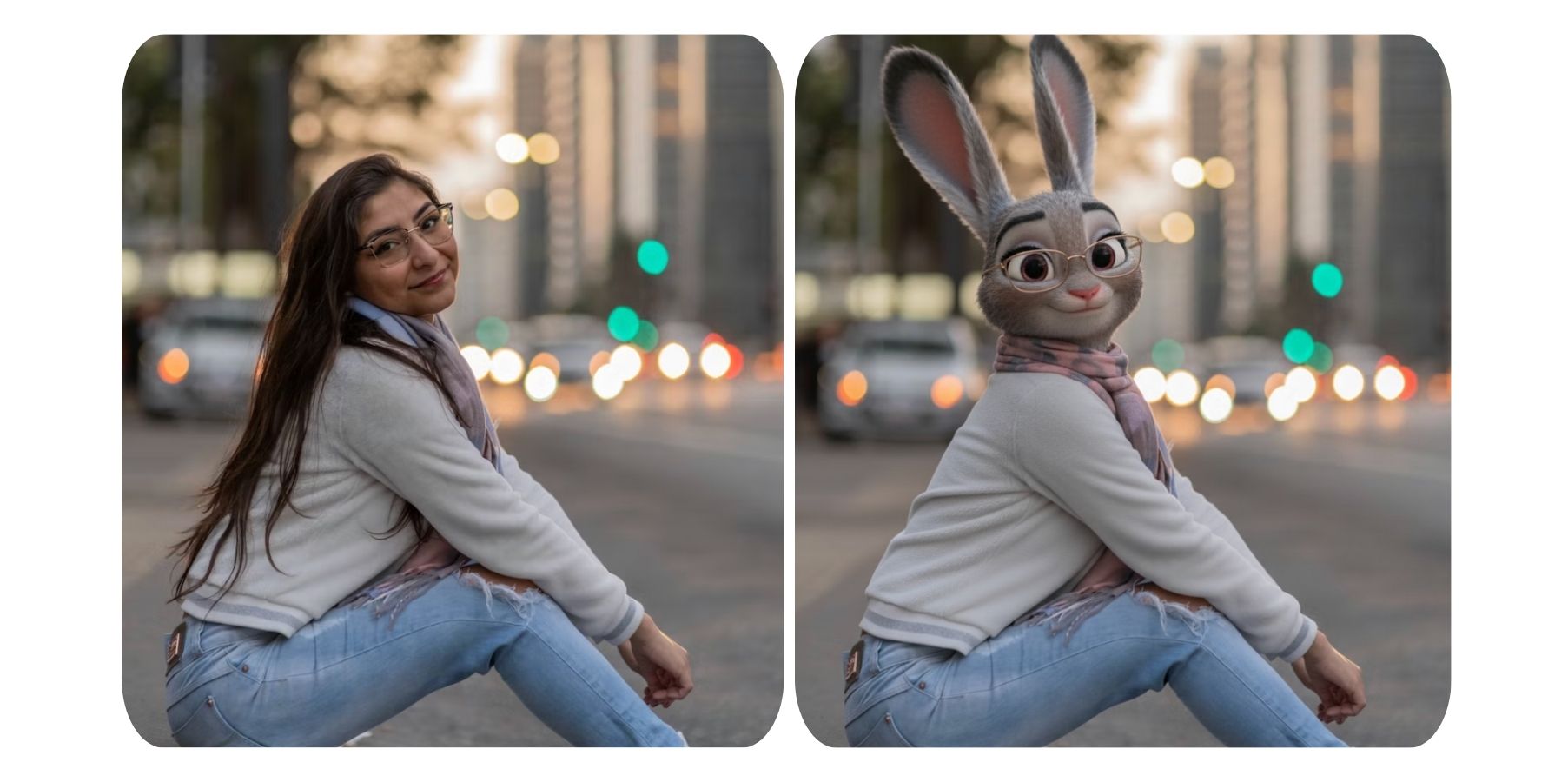Transform the person in the photo into Judy Hopps from Zootopia, while keeping the original cloth, pose and positioning.