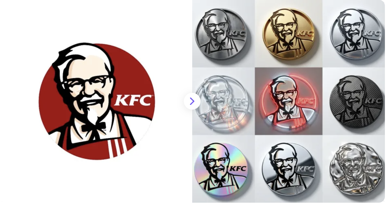 Upload your 2D logo and let AI create 9 photorealistic 3D versions in different materials on a clean, light background.