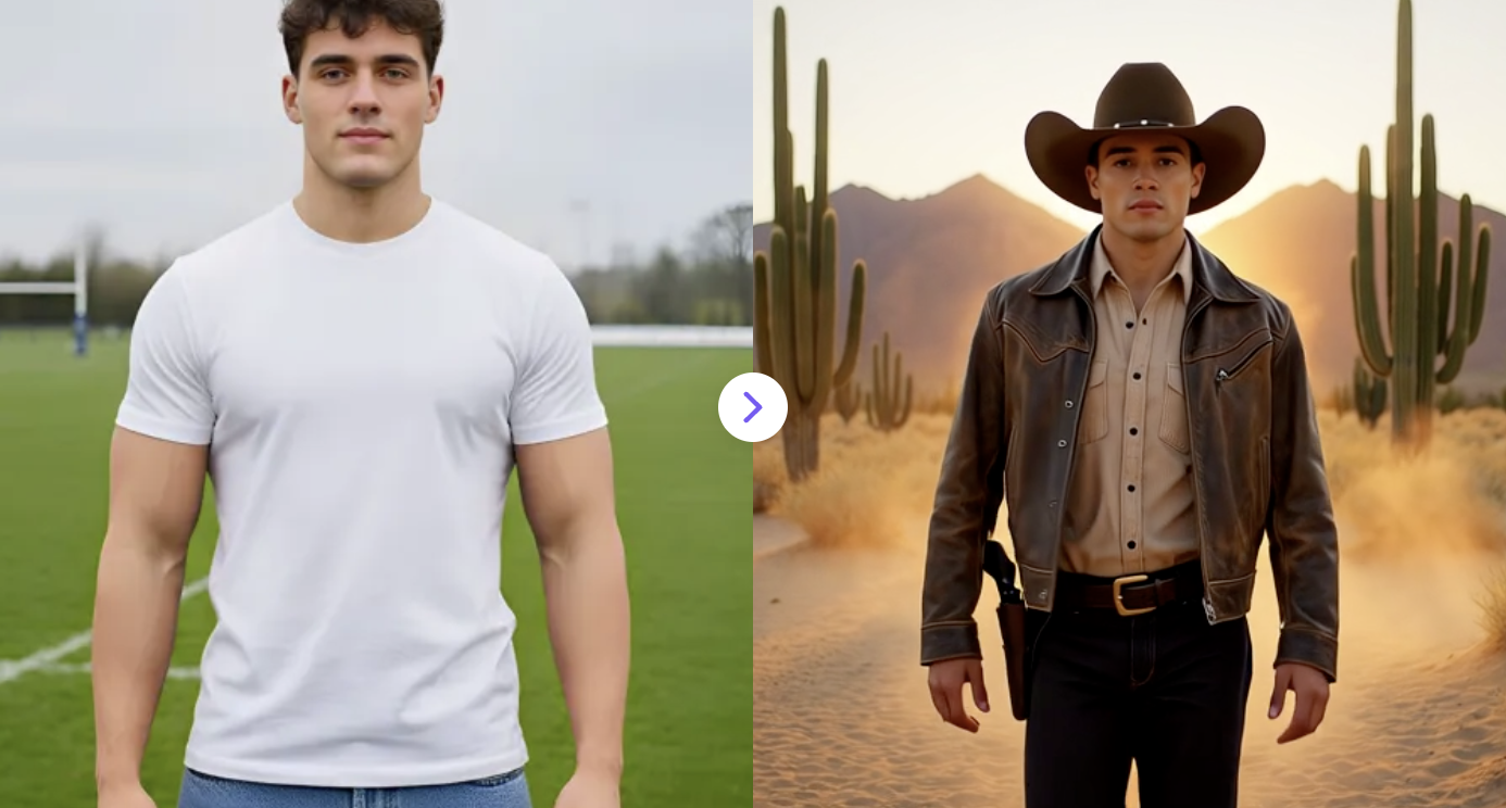 Turn your photo into a cinematic cowboy scene with hats, outfits, and western vibes in seconds.