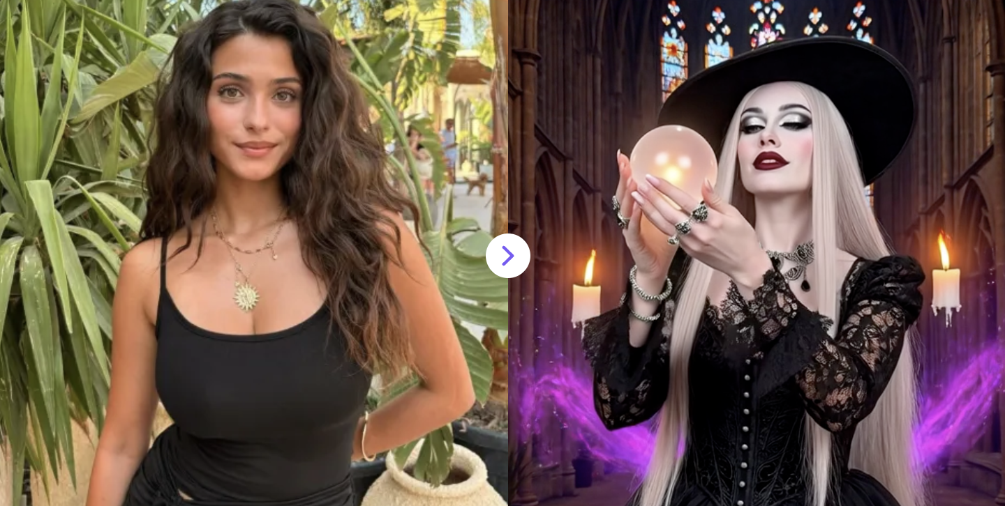 Upload a photo and transform into a mysterious gothic witch with dark magic effects, glowing orbs, and a dramatic Halloween atmosphere.
