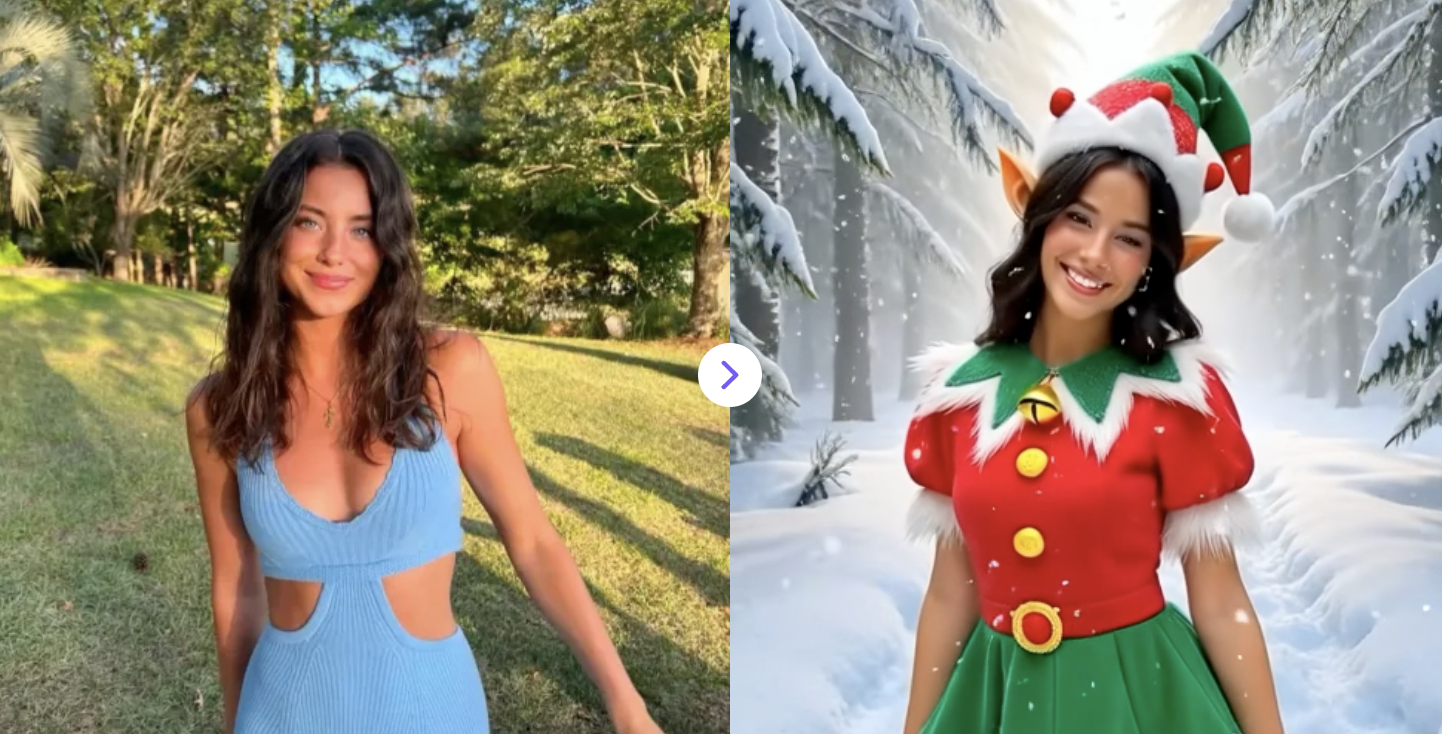 Snowflakes begin swirling around the person. The falling snow gradually wraps around the character and softly covers the scene as the transformation begins. As the snow clears, the person appears as a Christmas elf version of themselves, keeping the same face and recognizable facial features. Add natural pointed elf ears and dress the character in a cute festive red and green elf outfit with soft winter details and a playful elf hat. At the same time, the background transforms into a magical snowy forest with winter trees, light fog, and gently falling snow.