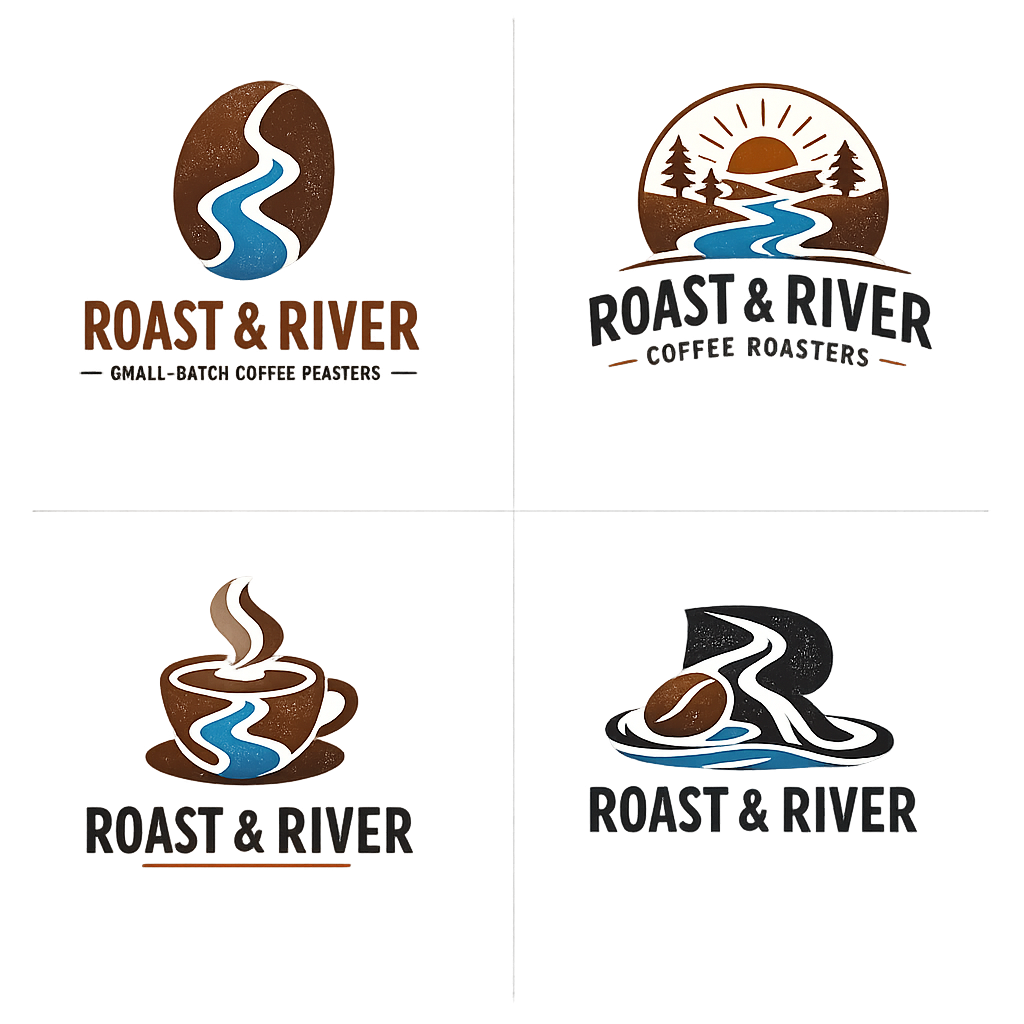 Generate 4 original logos for “Roast & River” — a small-batch coffee roaster.