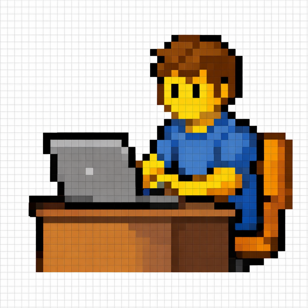 Use the same style from the input image and generate a person sitting at a desk using a laptop.