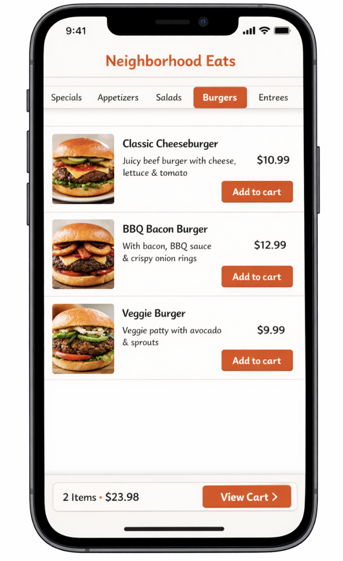 Restaurant Ordering App: Create a realistic mobile app UI mockup for a casual neighborhood restaurant. Show the menu screen with category tabs, a short list of dishes with photos, prices, and a simple “Add to cart” button. Include a minimal cart summary at the bottom. Design it to be fast and easy to understand. White background, warm accent colors, clean typography, and minimal visual noise. Place the UI mockup in an iPhone frame.