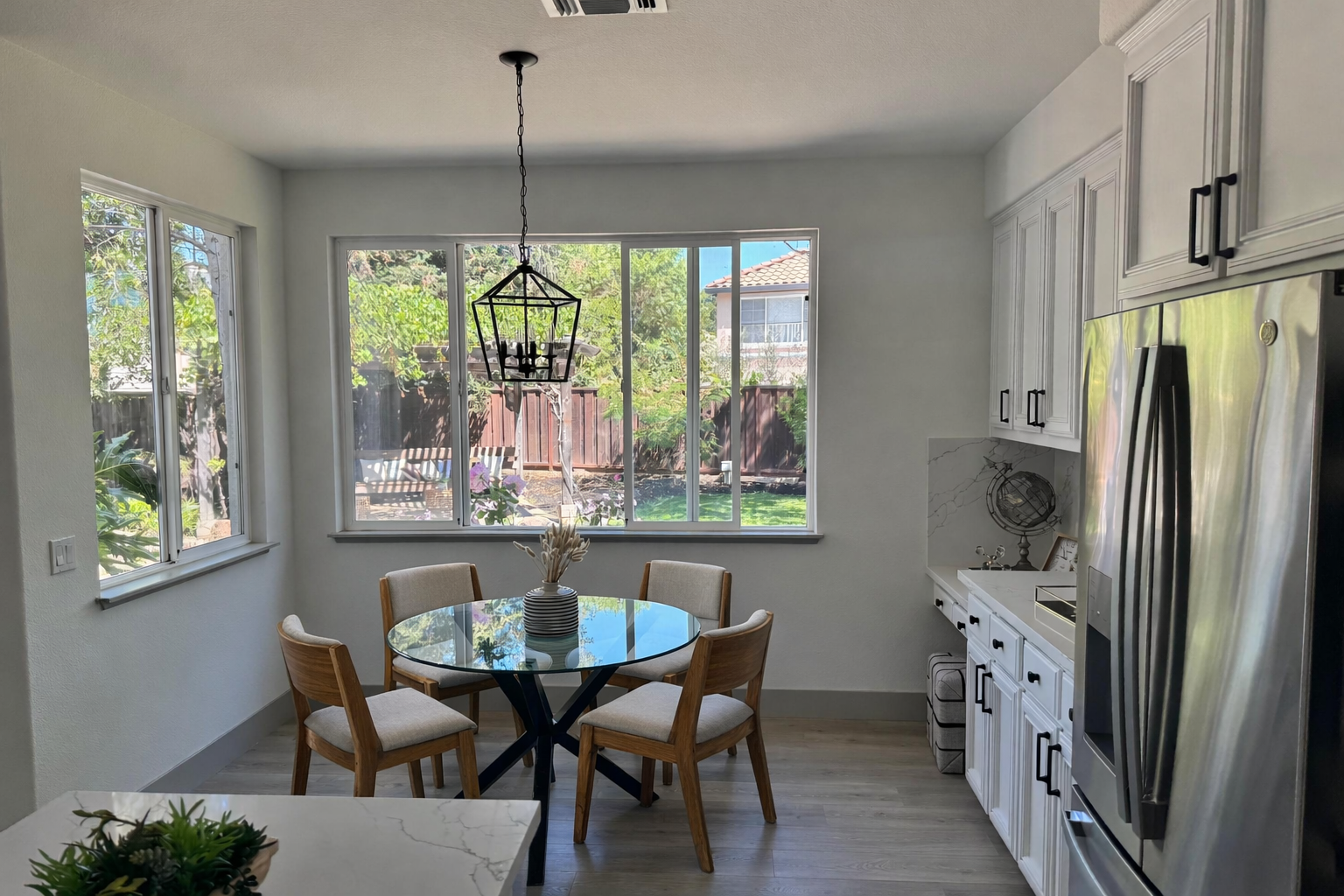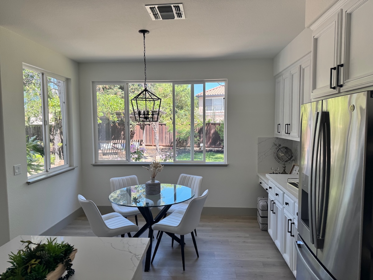 In this room photo, replace ONLY white with chairs made of wood. Preserve camera angle, room lighting, floor shadows, and surrounding objects. Keep all other aspects of the image unchanged. Photorealistic contact shadows and fabric texture.