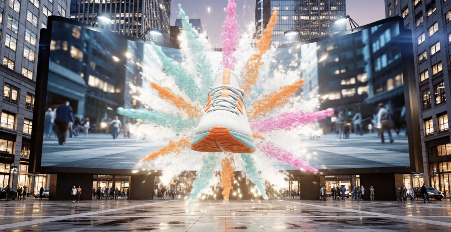 Animate the uploaded product on a curved 3D LED billboard in a busy city square. The product slowly rotates, then bursts toward the audience with forced perspective and flying particles. Cinematic lighting, high realism, Unreal Engine 5 style.