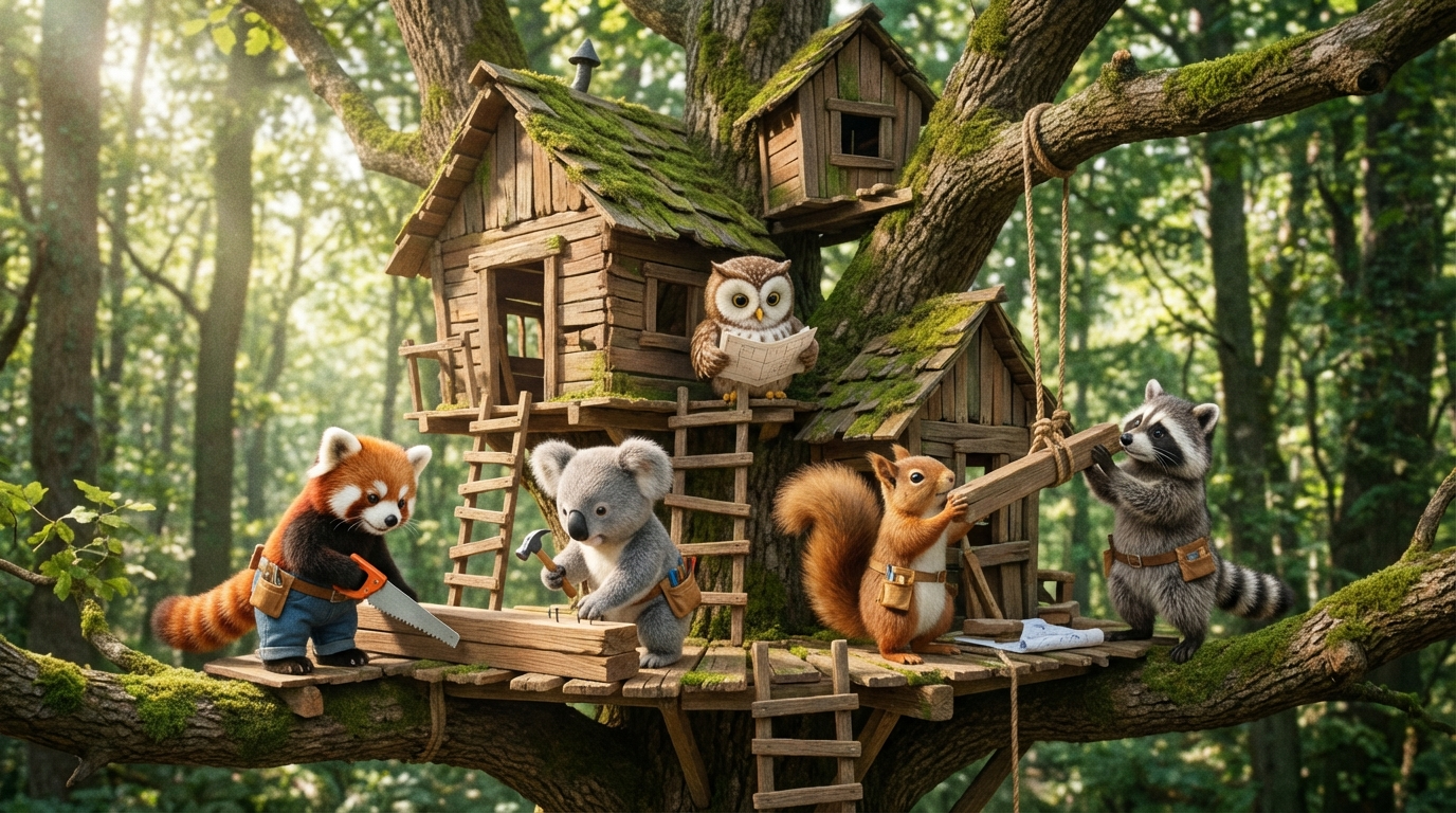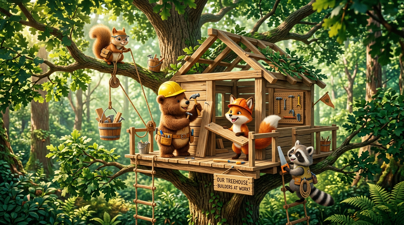 Fluffy friends building a treehouse