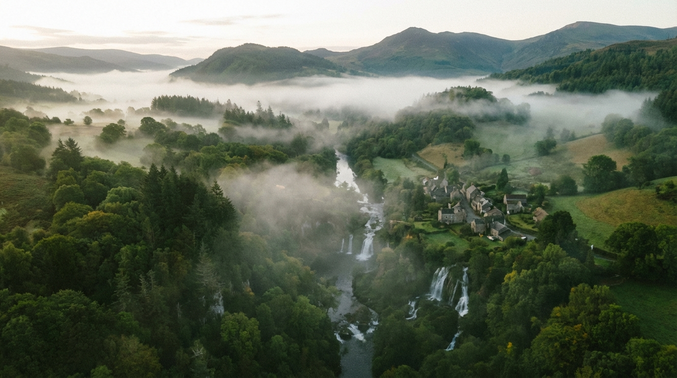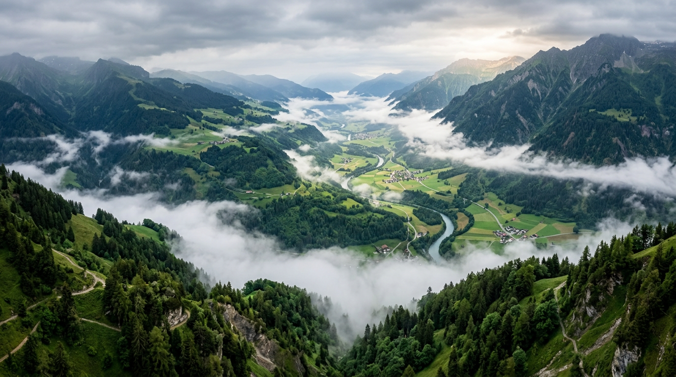 Misty panoramic aerial shot of a verdant valley