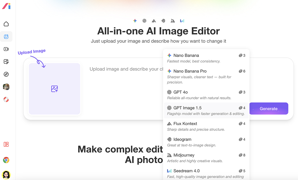 You can experience the image quality firsthand with LogoAI's All-in-One AI Image Editor. You'll have instant access to all the major image generation models in the world, including Nano Banana, GPT Image, Flux and more. Jump in right away, then judge what works best for the visuals you keep. Real results come from testing, not guesses.