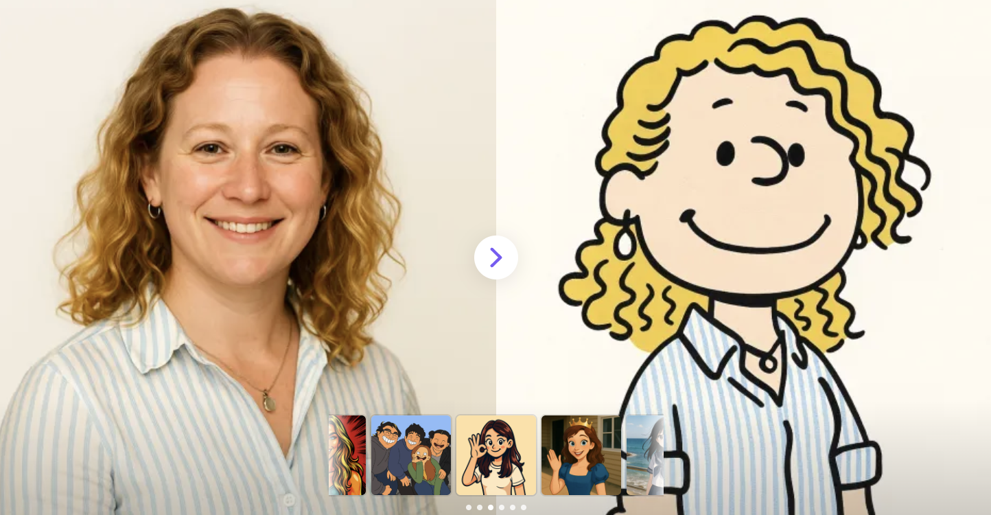 Upload your image and let our AI create a playful, Peanuts-inspired cartoon version of you.