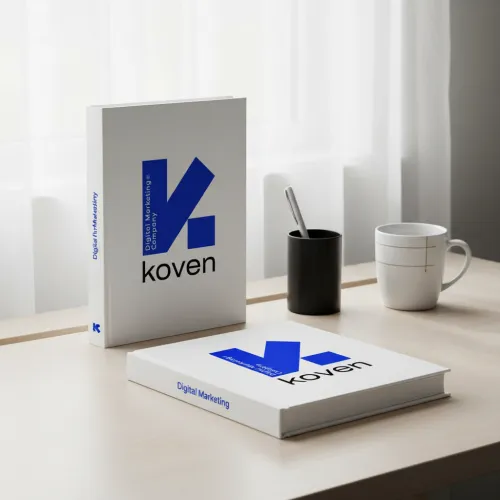 Minimal realistic open book mockup on white background, left page with uploaded logo, right page with brand-matching artistic photo, soft natural light, modern clean style.