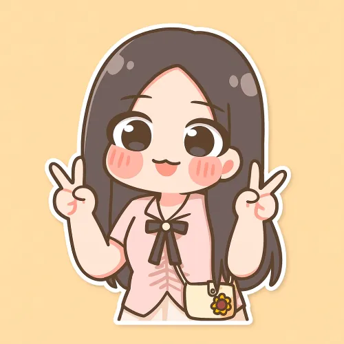 Transform the uploaded image into a chibi-style sticker with big eyes, blushing cheeks, and a cute expression. Keep hair and clothing recognizable, use bold outlines, soft pastel tones, and place on a flat background with a white sticker border. Make it playful, adorable, and anime-inspired.