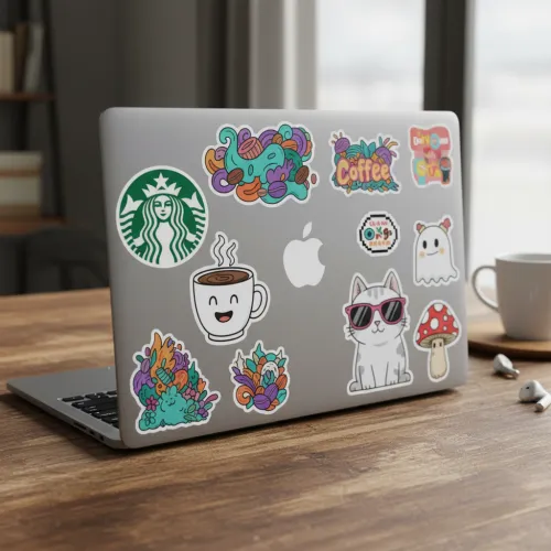 Create realistic sticker mockups instantly with your logo and brand colors in various shapes, sizes, and styles.