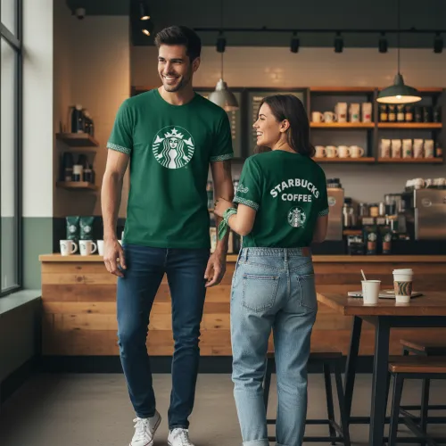 Realistic T-shirt mockup featuring one male and one female model in a brand-themed setting. One shows the front, the other the back. Logo clearly visible, outfits in brand colors with subtle accents. Natural interaction, soft lighting, detailed fabric, photorealistic lifestyle look.